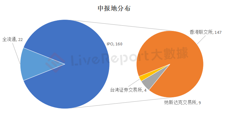境外上市IPO中,按申报地来看,赴港IPO数量最多,169家,占比超九成;纳斯达克交易所9家,台湾证券交易所4家。