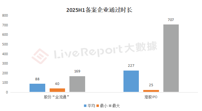 其中,在申请赴港上市或股份“全流通”的企业中,赴港IPO通过备案平均耗时227天,最快的是宁德时代,耗时25天,最慢的是聚水谭,耗时707天。