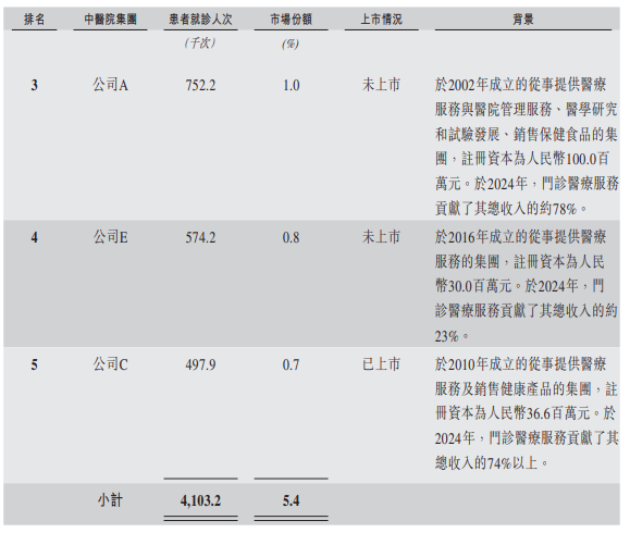 根据弗若斯特沙利文的资料,按2024年门诊医疗服务产生的收入计,公司在中国非公立中医院医疗服务行业的所有中医医院集团中排名第一。