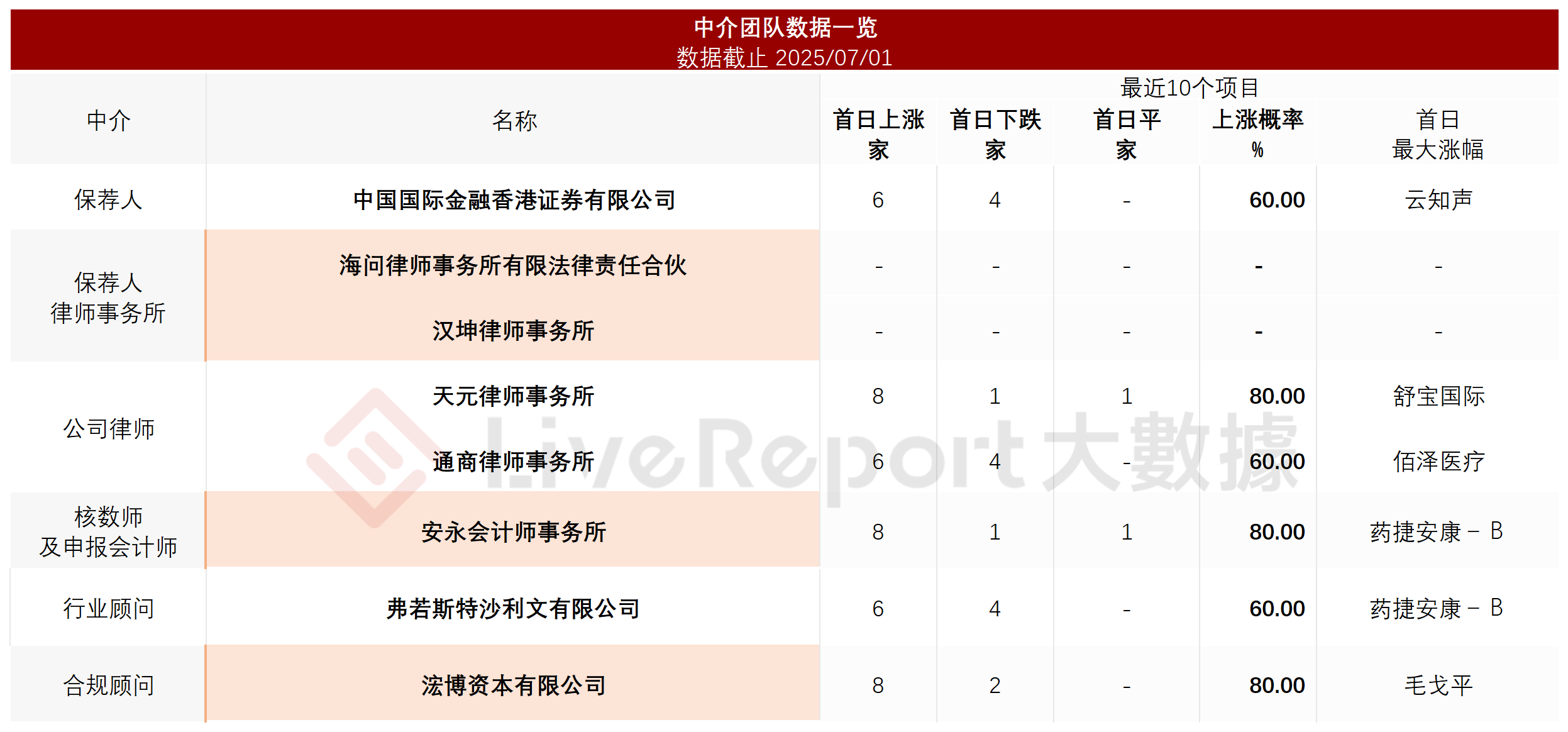 据LiveReport大数据统计,同仁堂中介团队共计8家,其中保荐人1家,近10家保荐项目数据表现一般;公司律师2家,综合项目数据一般。整体而言中介团队历史数据整体表现普通。