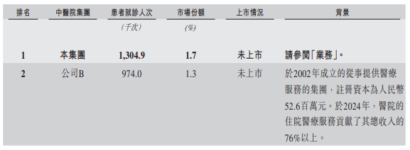 根据弗若斯特沙利文的资料,按2024年总门诊人次及住院人次计,公司在中国非公立中医院医疗服务行业的所有中医医院集团中排名第一。