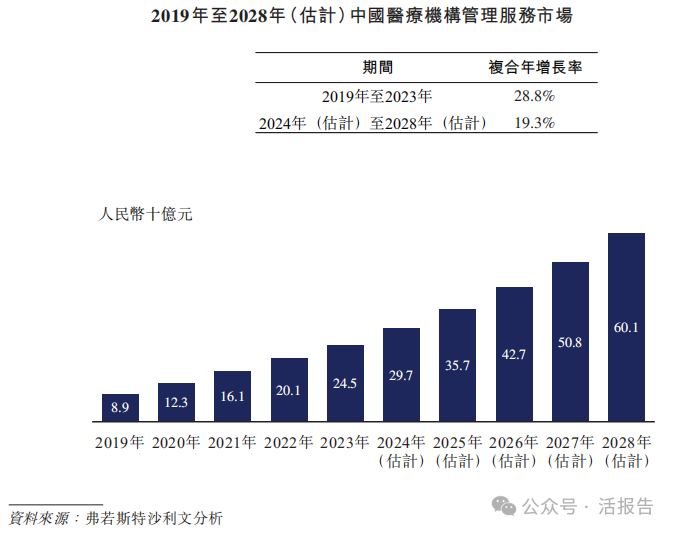 根据弗若斯特沙利文的资料,按医疗机构管理服务提供商创造的总收入计,中国医疗机构管理服务行业的市场规模从2019年的人民币89亿元增至2023年的人民币245亿元,预计将大幅增长,于2028年达到人民币601亿元,2024年至2028年的复合增长率为19.3%。