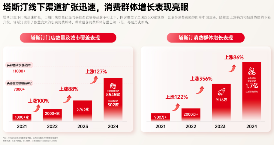 尽管塔斯汀未公开完整财报,但市场估算数据显示,其2023年营收约50亿元,2024年随着中式汉堡市场规模扩至320亿元,塔斯汀以37.9%的份额稳居首位,对应营收或超120亿元。