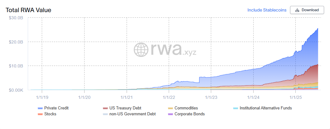 RWA整体规模从2022年的50亿美元激增至2025年7月的255亿美元以上(增长410%),成为继稳定币之后,加密货币领域增长第二快的领域。