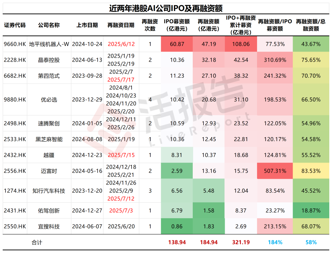 据统计,截至2025年7月17日,近两年在港上市的11家AI公司再融资总额高达18