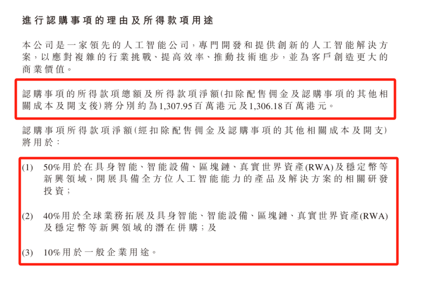 (2)40%用于全球业务拓展及具身智能、智能设备、区块链、真实世界资产(RWA)及稳定币等新兴领域的潜在并购;
