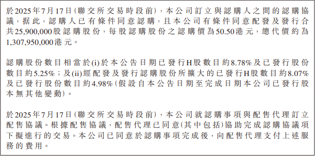此次发行的认购股份数目相当于公告发布日已发行H股总数的约8.78%以及已发行股份总数的约5.25%