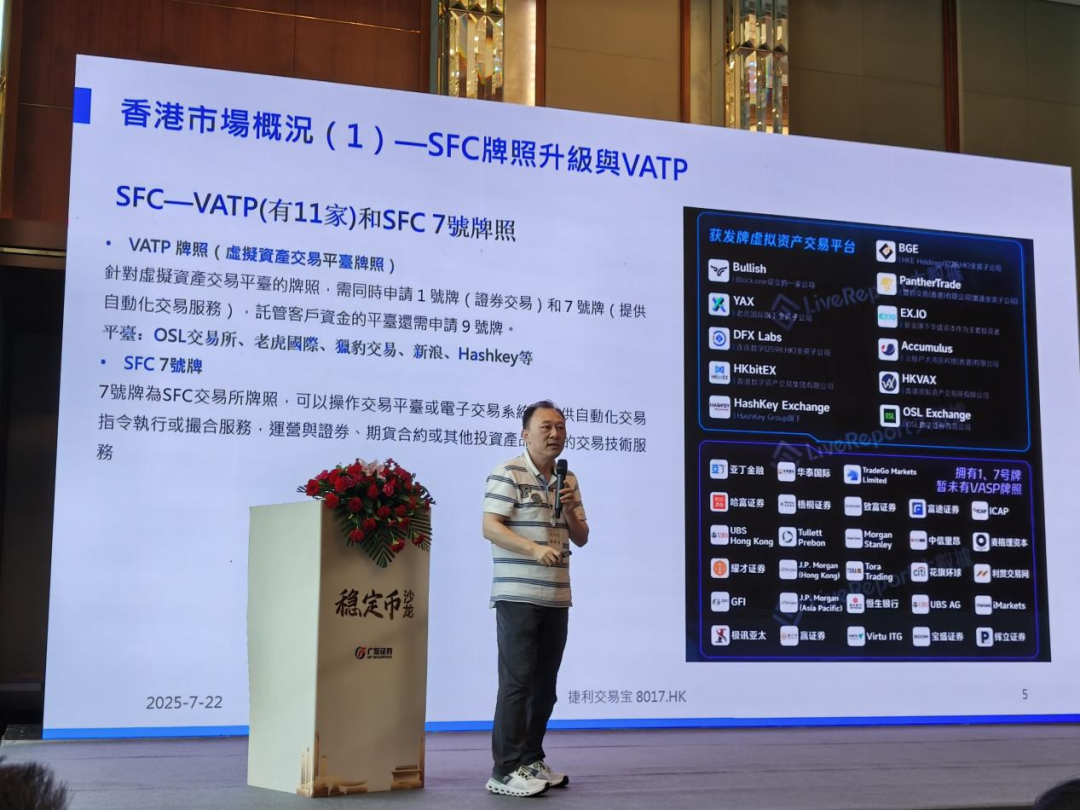 VATP牌照现状:针对专门的虚拟资产交易平台(VATP),同时持有香港证监会1号牌(证券交易)和7号牌(提供自动化交易服务)是前置条件。若平台涉及托管客户资金,则还需额外申请9号牌(资产管理)。据万勇介绍,目前香港共有11家平台成功获得了完整的VATP牌照。