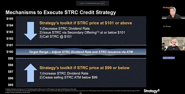 这个产品很有趣。和以往发行的优先股产品不同,STRC的价格会被控制在99刀至101刀的极窄波动区间内,而主要通过每月支付的高息分红来给持有人返还利益。