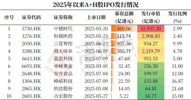 考虑到市场融资容量,市值越大发行比例一般就越小。宁德时代、恒瑞医药、海天味业的发行比例均低于5%,蓝思科技、三花智控则分别发行5%、1