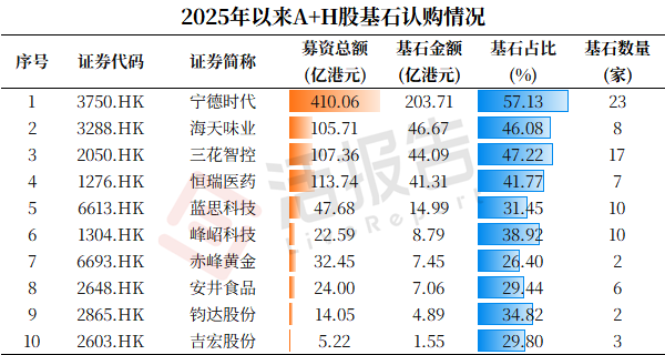 其中,作为标杆性企业的宁德时代、海天味业、三花智控、恒瑞医药的基石认购金额分别达约2