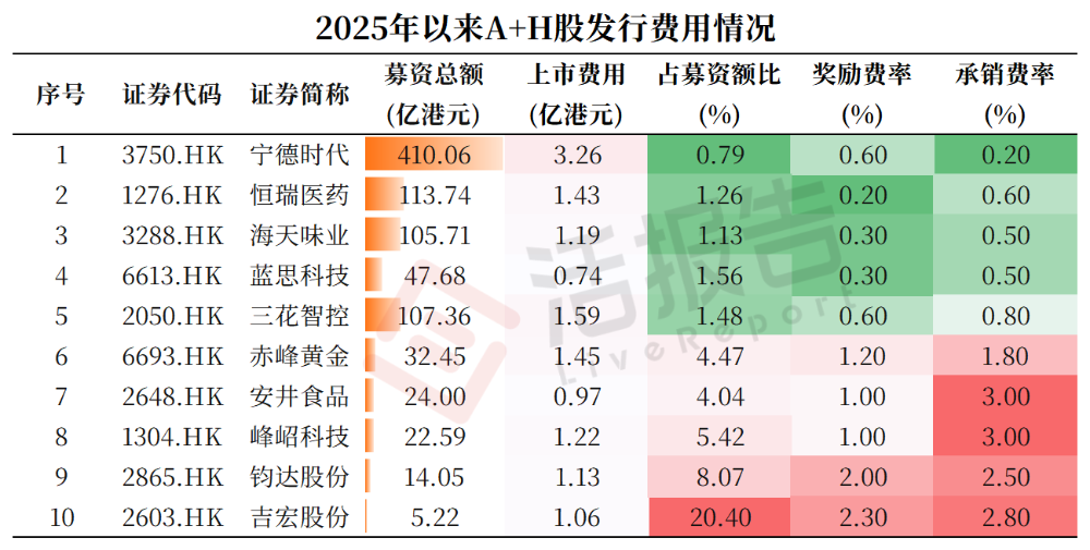 据LiveReport大数据统计,今年10家A+H股公司赴港上市的总上市费用合计约1
