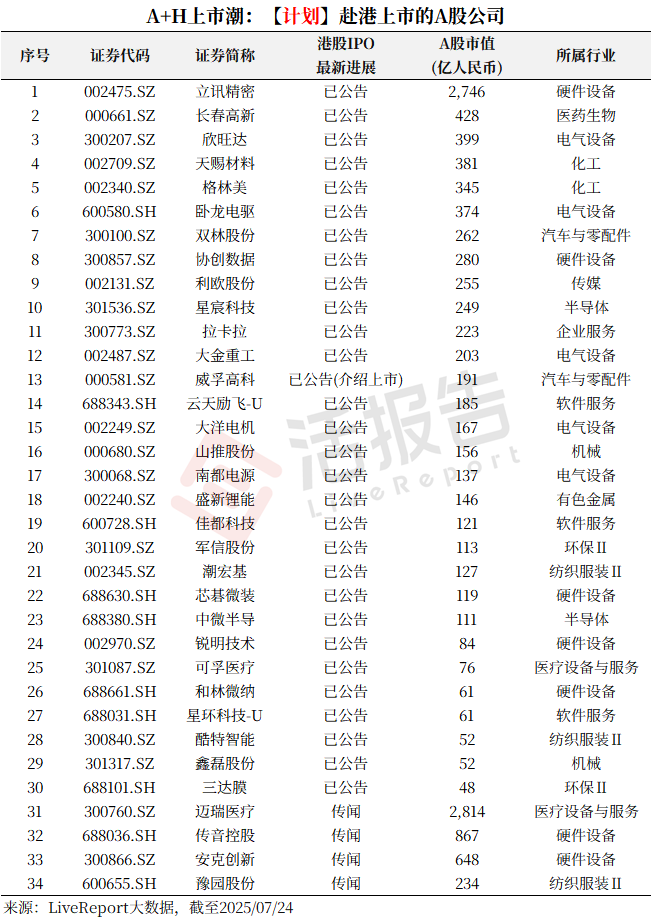 家,其中包括立讯精密、长春高新、欣旺达等知名企业。此外,迈瑞医疗、传音控股等巨头据称也将赴港上市。