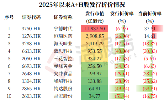 AH公司的发行市值越小,折价幅度越大。最近上市的AH项目,发行市值低于百亿的均折价50%发行,百亿规模的折价33%左右发行,千亿规模的大多折价20%左右发行,万亿规模的宁德时代