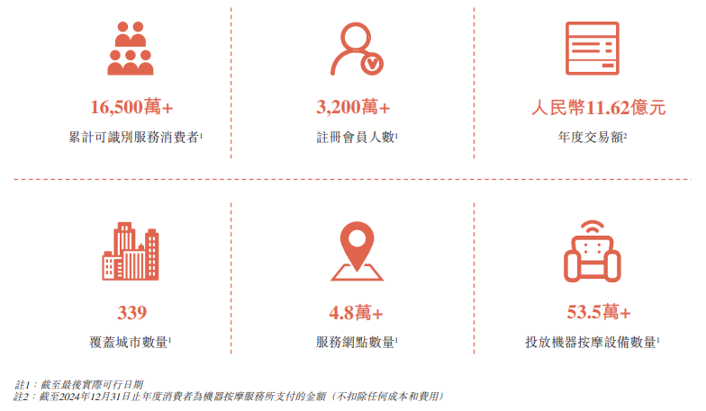 于最后实际可行日期,公司已为智能按摩服务设立超过48,000个服务网点,投放超过535,000张智能按摩设备,覆盖中国大陆地区31个省级行政区及339个城市。在消费者覆盖方面,公司拥有稳固的市场地位,于最后实际可行日期,累计可识别服务人数超过1.65亿,注册会员人数超过32百万名。