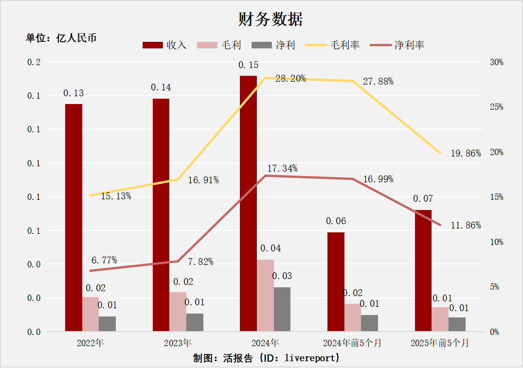 该图表展示公司2022 - 2025年前5个月的财务数据,收入、毛利、净利整体呈增长后波动态势,反映企业在发展过程中盈利指标有阶段性变化。