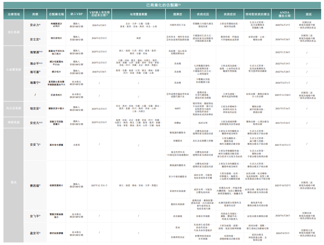 公司是一家处于商业化阶段的创新型制药公司。截至最后实际可行日期,公司已商业化的产品组合主要包括用于消化系统疾病、心血管系统疾病、内分泌系统疾病、神经系统疾病及炎症疾病的仿制药。