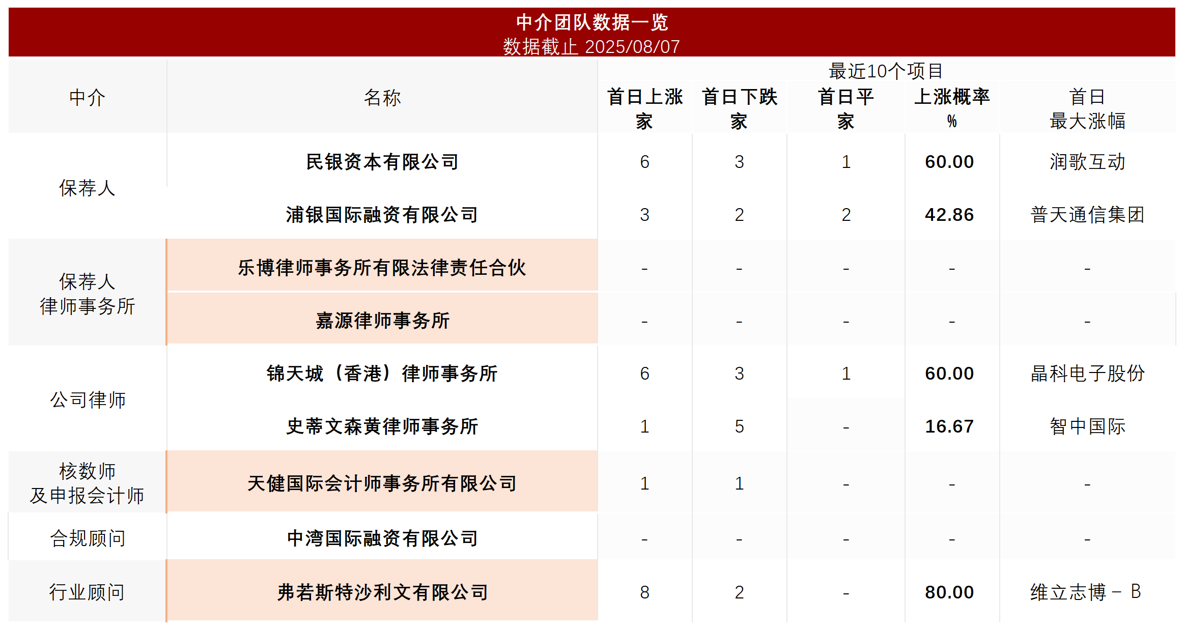 据LiveReport大数据统计,海清智元中介团队共计9家,其中保荐人2家,近10家保荐项目数据表现整体平平;公司律师共计2家,综合项目数据表现一般。整体而言中介团队历史数据较少,可参考性不高。