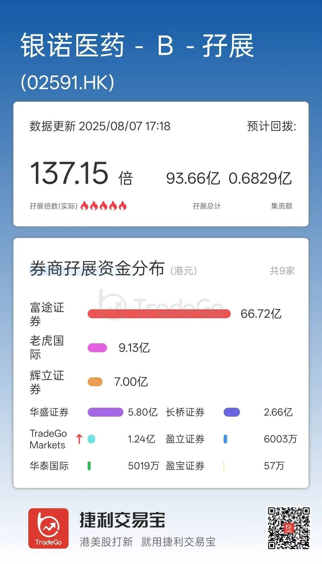 据捷利交易宝的新股孖展数据,截至8月7日17时,银诺医药-B首日的孖展总额约93.66亿港元,孖展认购倍数约137.15倍。其中,富途证券、老虎国际及辉立证券分别放出66.72亿、9.13亿及7.0亿港元。