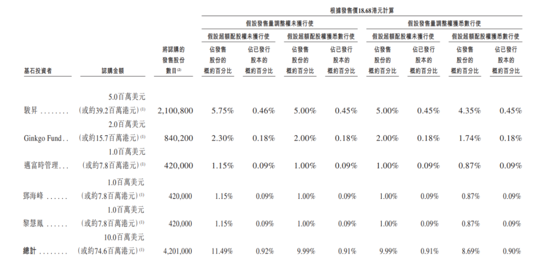 引入的基石投资者分别为骏升环球、Ginkgo Fund、迈富时(2556.HK)、邓海峰及黎慧凤,投资金额分别为3920万、1570万、780万、780万及780万港元。