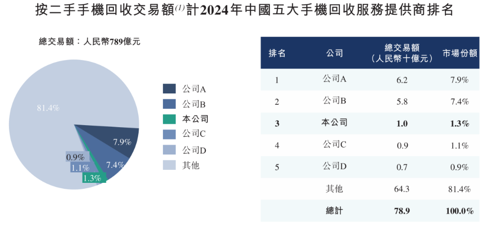 按2024年手机装置的总交易额计,本公司是第三大手机回收服务提供商,交易额为人民币10亿元,占市场的1.3%。