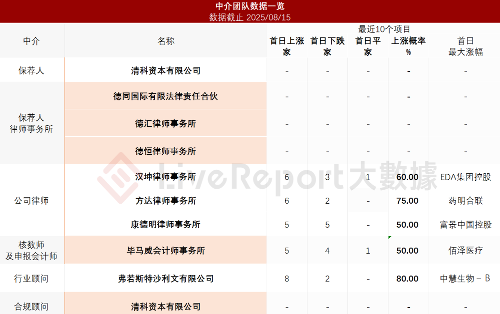 据LiveReport大数据统计,闪回科技中介团队共计7家,独家保荐人为清科资本有限公司,新星之秀;公司律师共计3家,综合项目数据表一般。但中介团队历史数据可参考性较低。