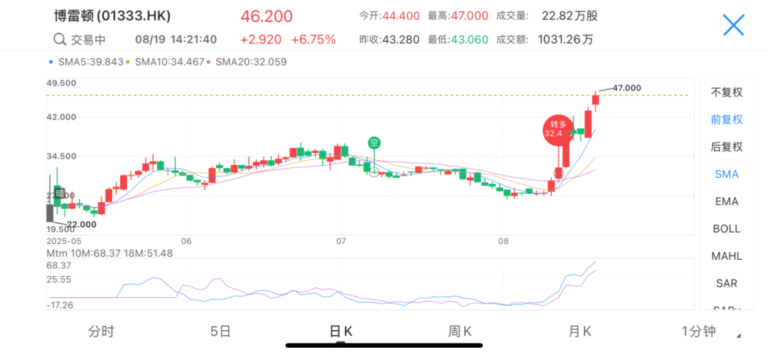 资本市场的嗅觉向来敏锐。8月11日开盘,博雷顿股价启动拉升8.55%。随后一周,博雷顿股价屡创新高,累计涨幅接近70%。