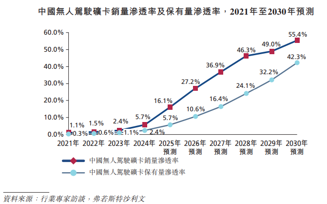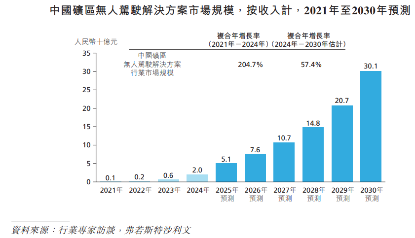 根据弗若斯特沙利文(Frost & Sullivan)数据,按收入计,中国矿区无人驾驶解决方案的市场规模将从2025年的约人民币51亿元增至2030年的人民币301亿元,期间复合年增长率为57.4%。