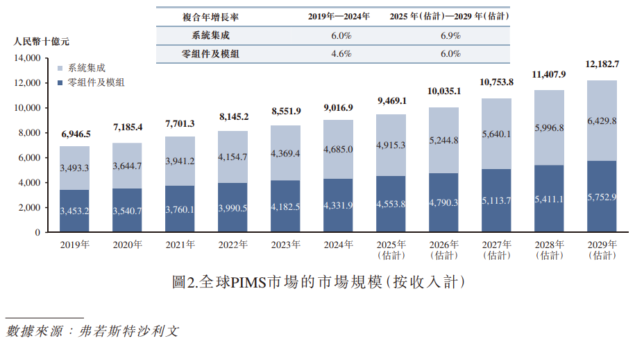 据 弗若斯特沙利文 ( Frost & Sullivan ) 的资料, 在 2019 年至 2024 年,全球 精密智造解决方案 ( PIMS ) 市场的规模稳定增长,由人民币 69,465 亿元增加至人民币 90,169 亿元,复合年增长率达 5.4% ; 预计将由 2025 年的人民币 94,691 亿元增加至 2029 年的人民币 121,827 亿元,即 2025 年 -2029 年复合年增长率为 6.5% 。