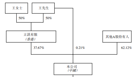 立讯有限 ( 王女士及王先生 各占 50% )持股 37.67% ,王先生直接持股 0.21% ; 其他 A 股股东合计持股 62.12% 。