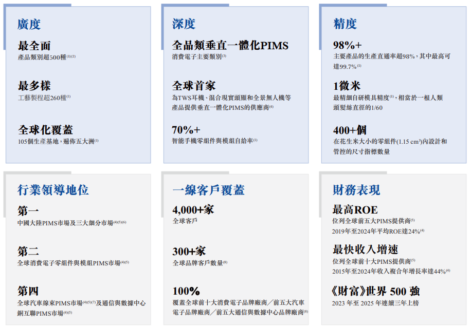 根据弗若斯特沙利文的资料,按 2024 年收入计, 公司 在精密智造解决方案 (PIMS) 行业中排名全球第四、中国大陆第一,并在消费电子、汽车电子、通信与数据中心等各主要业务线均处于全球领先地位;在全球精密智造解决方案提供商中, 公 司 拥有最全 面及最多元化的产品组合。 公司 于 2023 年至 2025 年连续三年跻身《财富》世界 500 强榜单。