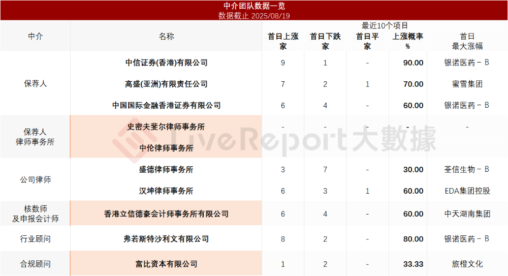据 LiveReport 大数据统计,立讯精密中介团队共计 10 家,其中保荐人 3 家,保荐项目数据表现尚可;公司律师 2 家,综合项目数据不尽如意。整体而言中介团队历史数据整体表现普通。