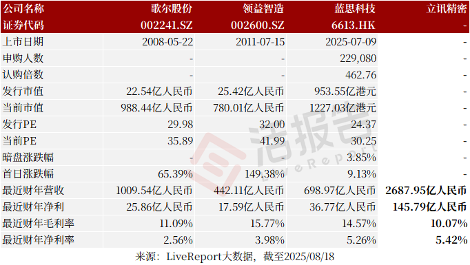 2025 年 8 月 18 日, 立讯精密 首次向港交所递交招股书,拟在香港主板 实现 A+H 上市,联席保荐人为 中信证券、中金公司、高盛 。公司是 全球领先的精密智造创新科技公司 , 2024 年收入 2688 亿元,净利润 146 亿元,毛利率 约 10 % 。