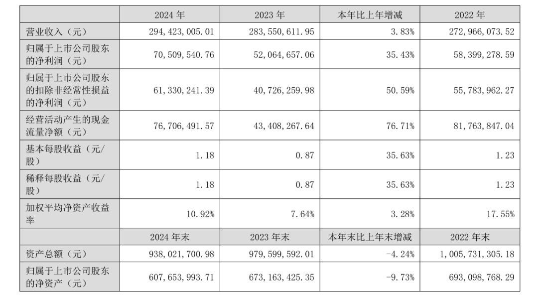 2024年该公司营收微增3.83%,净利润、扣非净利润、经营现金流、每股收益等盈利与现金流指标均大幅增长,盈利能力提升;但资产总额和归属于上市公司股东的净资产较上年末有所下降,需关注资产结构变化 。