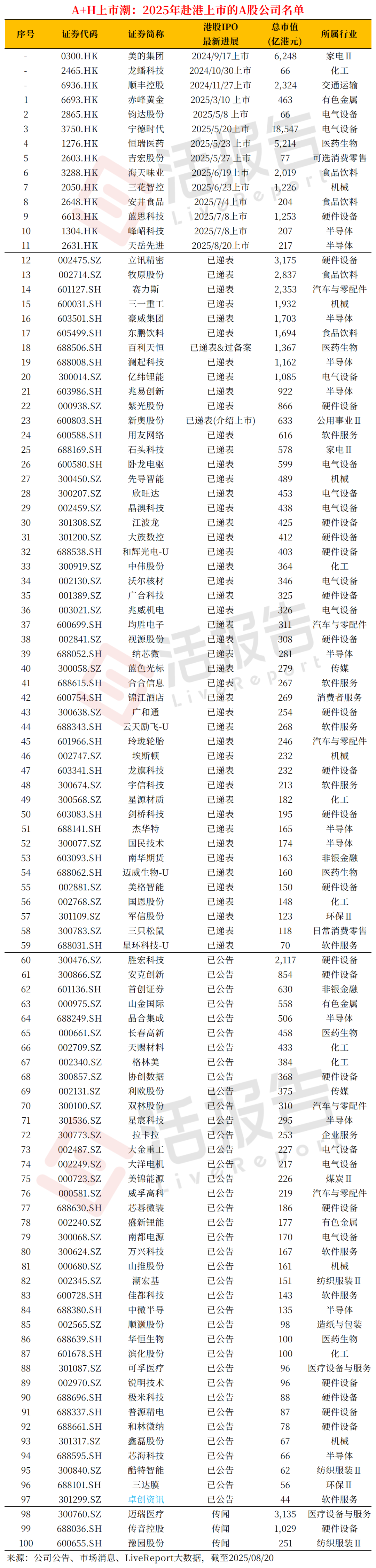 据LiveReport大数据统计,截至8月19日,今年已有赤峰黄金(6693.HK)、钧达股份(2865.HK)、宁德时代(3750.HK)、恒瑞医药(1276.HK)、吉宏股份(2603.HK)、海天味业(3288.HK)、三花智控(2050.HK)、安井食品(2648.HK)、蓝思科技(6613.HK)、峰岹科技(1304.HK)及天岳先进(2631.HK)等11家A股公司登陆港交所,实现AH上市;