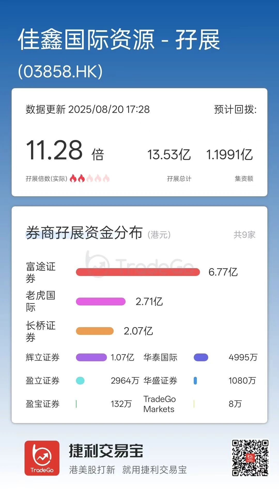 据捷利交易宝的新股孖展数据,截至8月20日17时,佳鑫国际资源首日的孖展总额约13.53亿港元,孖展认购倍数约11.28倍。其中,富途证券、老虎国际、长桥证券分别放出6.77亿、2.71亿、2.07亿港元。