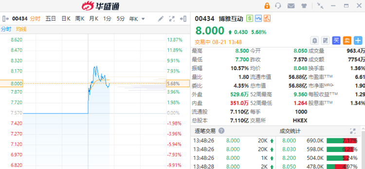 8月21日讯,港股博雅互动(00434)午后复牌一度涨近9%,截至发稿,涨5.68%,报8.00港元,成交额7754万港元。