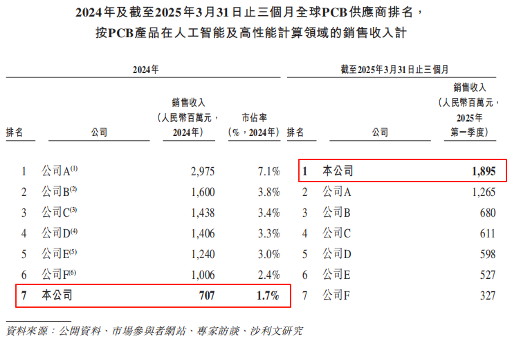 以2025年第一季度PCB在人工智能及高性能计算领域的销售收入计,公司在全球PCB市场中排名第一。