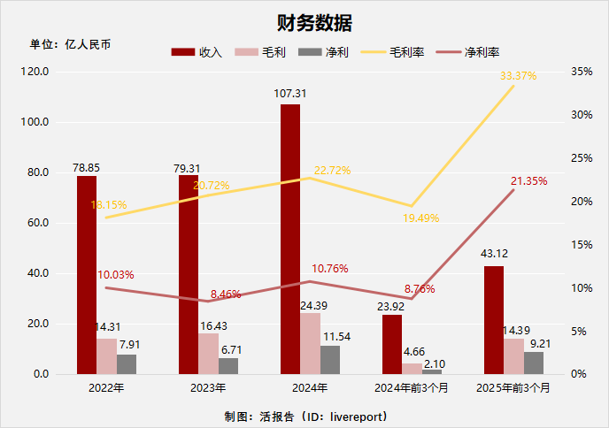 2024年收入为107.31亿元(年复合增长16.66%),净利润为11.54亿元(年复合增长20.84%),2025年前三月收入43.12亿元,净利润9.21亿元。