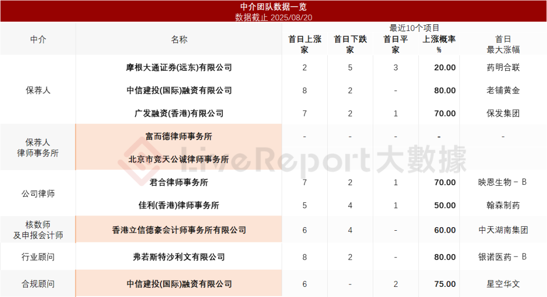 据LiveReport大数据统计,胜宏科技中介团队共计10家,其中保荐人3家,保荐项目数据表现整体尚可;公司律师2家,综合项目数据一般。整体而言中介团队历史数据整体表现无亮点。