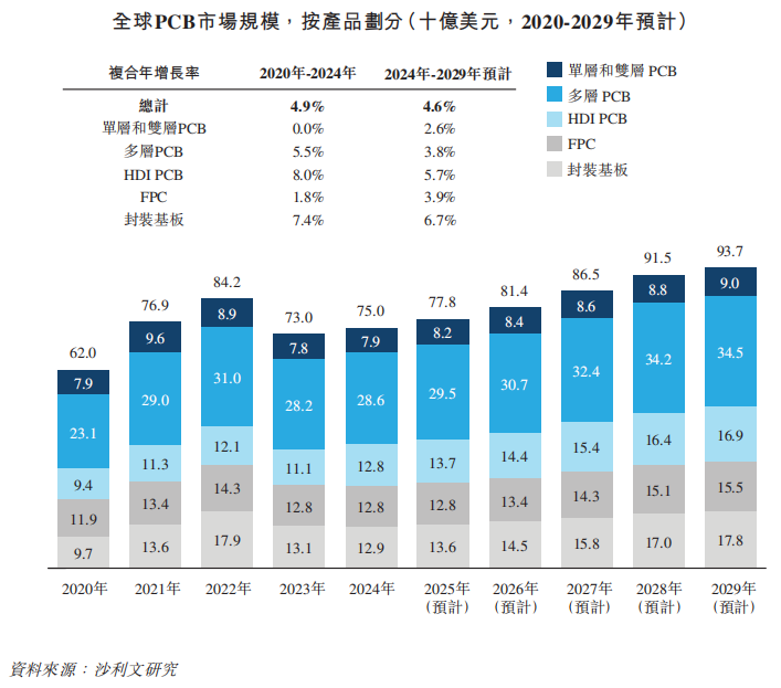 根据弗若斯特沙利文,以销售收入计,全球PCB市场规模从2020年的620亿美元增长至2024年的750亿美元,2020年至2024年期间的复合年增长率为4.9%。预计到2029年PCB市场全球销售收入将达到937亿美元,2024年至2029年期间的复合年增长率为4.6%。