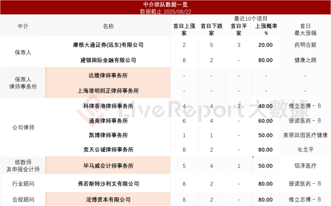 据LiveReport大数据统计,群核科技中介团队共计11家,其中保荐人2家,近10家保荐项目数据表现一般;公司律师共计4家,综合项目数据不尽如意。整体而言中介团队历史数据表现一般。