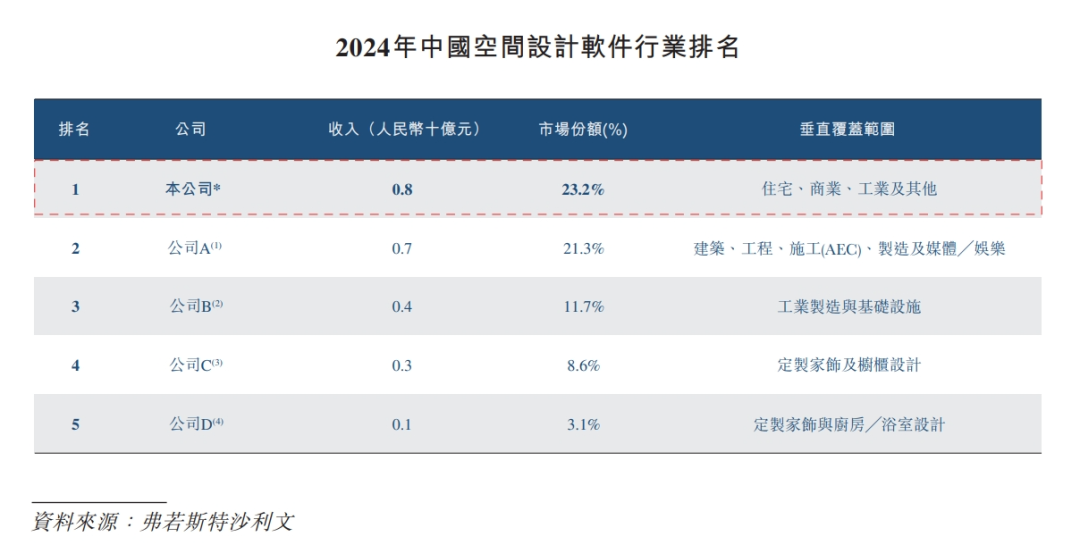 根据弗若斯特沙利文的资料,按2024年的收入计,公司是中国最大的空间设计行业软件提供商,约占市场份额的23.2%。公司的产品矩阵主要包括: