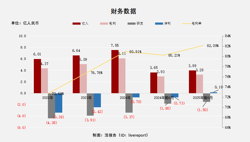 过去三年公司收入、毛利均稳步增长,最终毛利率提升至80%以上,研发费用有所减少,经调整净亏损逐步收窄。2025年上半年,公司财务迎来极大改善个,净利正式扭亏为盈!