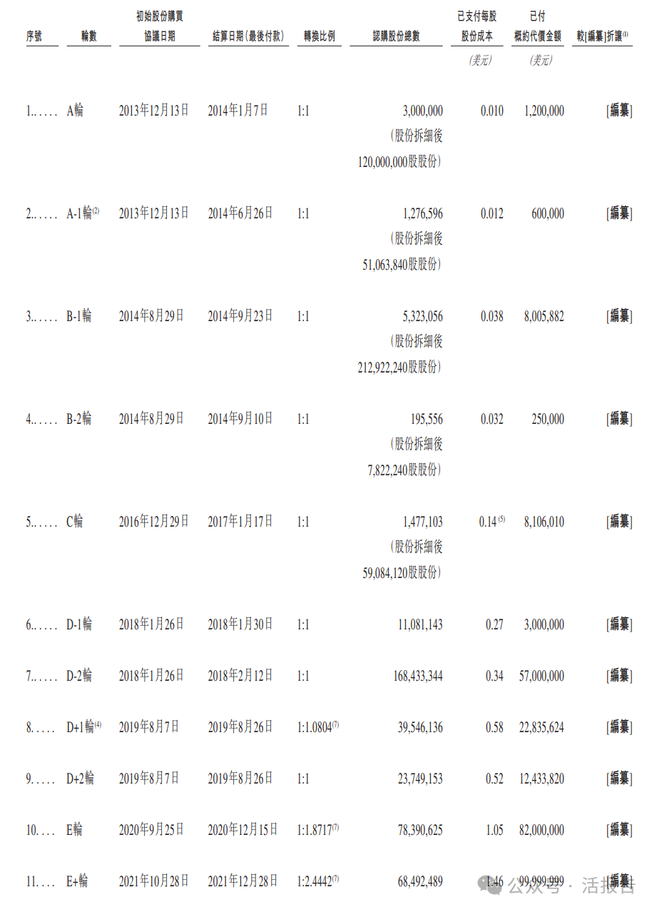 公司上市前经历了多轮融资,在2021年的E+轮融资中,公司融资1亿美元,每股成本概约为1.46美元,对应投后估值约为22.5亿美元(175亿港元)。