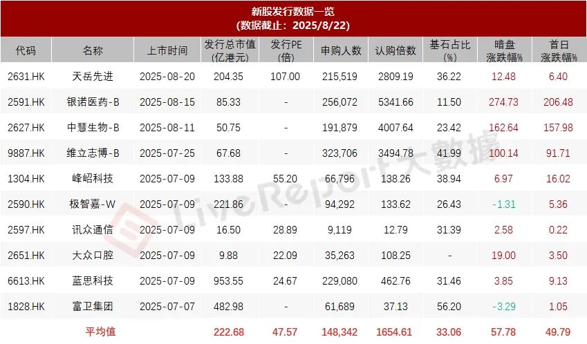 据LiveReport大数据,近10家上市新股平均发行市值为222.68亿,最大市值为蓝思科技,最小市值为大众口腔;平均发行PE为47.57倍,PE处于中高位水平;平均申购人数为148,342人,平均认购倍数为1654.61倍;平均基石占比为33.06%,基石平均比例略有下降;近10只新股暗盘平均上涨57.78%,首日平均上涨49.79%;截至当前,港股新股首日实现十连涨,打新热度还在持续。但新规实施以来,散户整体中签率更低,双登股份全员抽签,佳鑫国际也采用机制B(不回拨),预计中签率也极低。