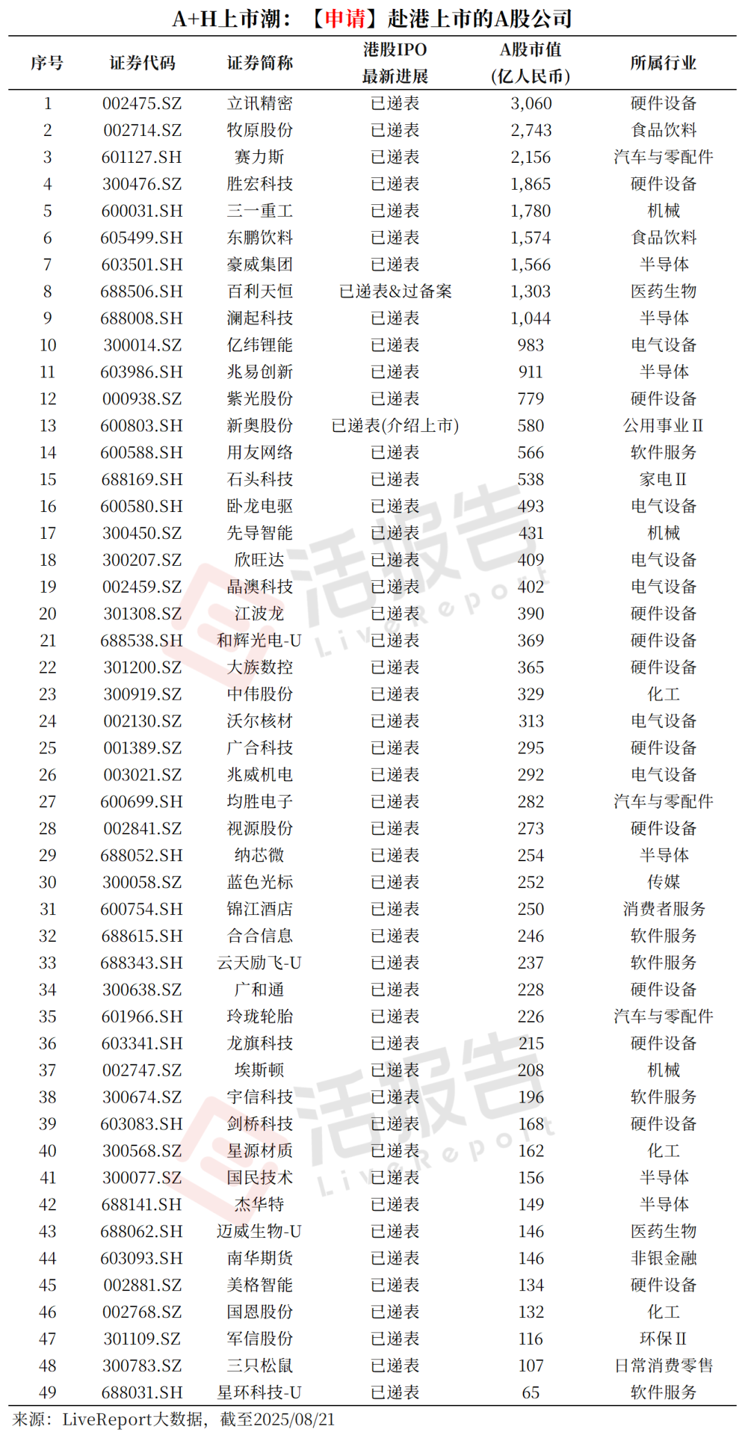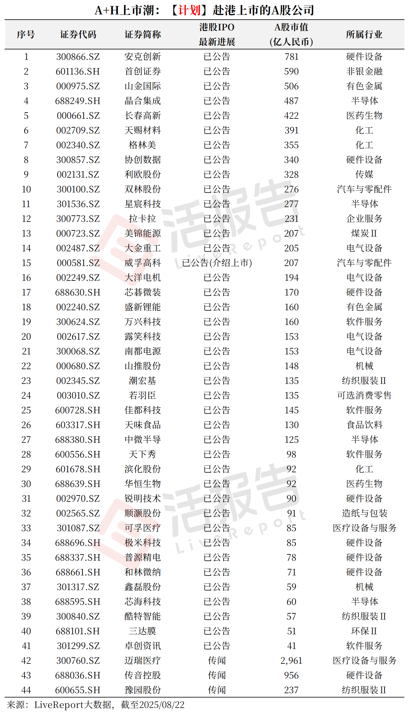 据LiveReport大数据统计,截至8月21日,今年已有赤峰黄金(6693.HK)、钧达股份(2865.HK)、宁德时代(3750.HK)、恒瑞医药(1276.HK)等11家A股公司登陆港交所;同时,至少还有90家公司拟“A+H”上市,包括49家已递表,41家已发公告,3家传闻上市。