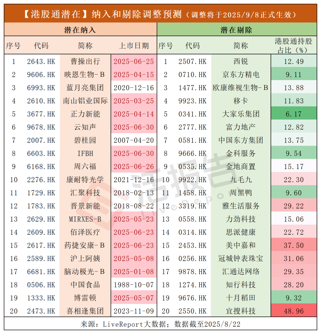 据LiveReport大数据预测,于2025年9月8日的港股通调整中,预计新纳入20只股票,分别为:曹操出行、映恩生物-B、蓝月亮集团、南山铝业国际、正力新能、云知声、碧桂园、IFBH - F、周六福、康耐特光学、汇聚科技、晋景新能、MIRXES-B - F、佰泽医疗、药捷安康-B、沪上阿姨、脑动极光-B、中国食品、博雷顿、喜相逢集团。