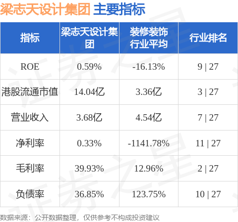 梁志天设计集团港股市值14.04亿港元,在装修装饰行业中排名第3。主要指标见下表: