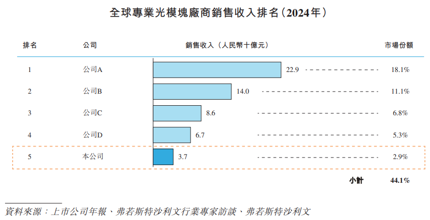 年,按全球光模块收入计,公司在全球所有专业光模块厂商中排名第五;按中国光模块收入计,公司在全球所有专业光模块厂商中排名第三;按全球数通光模块收入计,公司在全球所有专业光模块厂商中排名前五;按全球
